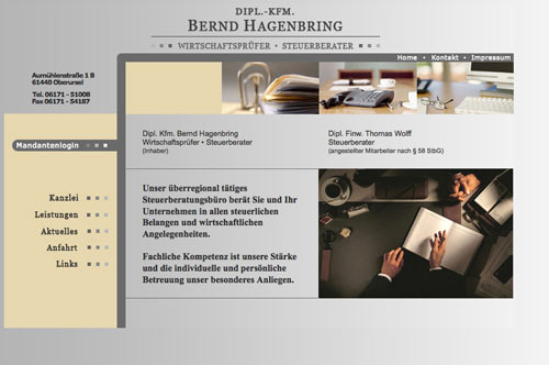 Privatpersonen, Freiberufler, Unternehmer und Existenzgründer stehen im deutschen Steuerrecht vor vielen Fragen. Steuerberater und Wirtschaftsprüfer Dipl. Kfm. Bernd Hagenbring aus Oberursel hat es sich zur Aufgabe gemacht, diese zu beantworten. Der Steuerberater kennt die Probleme, Fragen und Verwirrungen, die sich Steuerzahlern täglich offenbaren. Kaum ein Land hat so viele Steuergesetze wie Deutschland. Hinzu kommt: Durch die stetige Veränderung der Gesetze behalten zumeist nur noch Steuerberater den Durchblick. In seiner modern eingerichteten Steuerberatungskanzlei in Oberursel steht er seinen Mandanten mit Rat und Tat zur Seite, um nicht nur Steuerfragen zu beantworten, sondern auch die Steuerlast des Einzelnen zu mindern.